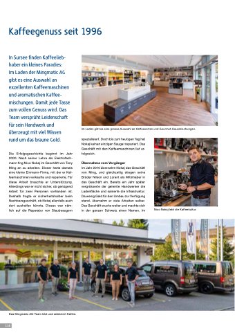 1114 Kaffeegenuss seit 1996 In Sursee finden Kaffeelieb- haber ein kleines Paradies: Im Laden der Mingmatic AG gibt es eine Auswahl an exzellenten Kaffeemaschinen und aromatischen Kaffee- mischungen. Damit jede Tasse zum vollen Genuss wird. Das Team versprüht Leidenschaft für sein Handwerk und überzeugt mit viel Wissen rund um das braune Gold. Die Erfolgsgeschichte beginnt im Jahr 2000. Nach seiner Lehre als Elektrofach- mann fing Nico Nokaj im Geschäft von Tony Ming an zu arbeiten. Dieser hatte damals eine kleine Einmann-Firma, mit der er Kaf- feemaschinen verkaufte und reparierte. Für diese Arbeit brauchte er Unterstützung. Allerdings war er nicht sicher, ob genügend Arbeit für zwei Personen vorhanden ist. Deshalb fragte er sicherheitshalber beim Nachbarsgeschäft, ob Nokaj allenfalls auch dort aushelfen könnte. Dieses war näm- lich auf die Reparatur von Staubsaugern Im Laden gibt es eine grosse Auswahl an Kaffeesorten und Gourmet-Hausmischungen. spezialisiert. Doch bis zum heutigen Tag hat Nokaj keinen einzigen Sauger repariert. Das Geschäft mit den Kaffeemaschinen lief er- folgreich. Übernahme vom Vorgänger Im Jahr 2010 übernahm Nokaj das Geschäft von Ming, und gleichzeitig stiegen seine Brüder Nilson und Lorent als Mitinhaber in das Geschäft ein. Bereits ein Jahr später vergrösserte der gelernte Handwerker die Ladenfläche und sanierte die Infrastruktur. Da wenig Geld für den Umbau zur Verfügung stand, übernahm er viele Arbeiten selber. Das Geschäft wuchs weiter und machte sich in der ganzen Schweiz einen Namen. Im Nico Nokaj lebt die Kaffeekultur. Das Mingmatic AG-Team lebt und zelebriert Kaffee.