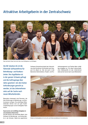 1216 Attraktive Arbeitgeberin in der Zentralschweiz Das motivierte Team freut sich über neue Kolleginnen und Kollegen. Die BK Solution AG ist die führende Softwarefirma für Betreibungs- und Konkurs- ämter. Ihre Applikation ist in der ganzen Schweiz gefragt und die Auftragslage über Jahre gesichert. Um den hohen Anforderungen gerecht zu werden, ist das Unternehmen stets auf der Suche nach neuen Mitarbeitenden. Besonders interessant sind Personen, die über Erfahrungen im Betreibungs- und Kon- kurswesen verfügen. Die zukünftigen Mitar- beitenden können sich auf gute Anstel- lungsbedingungen und ein kollegiales Team freuen. Spannende und vielfältige Aufgaben in verschiedenen Bereichen Die BK Solution AG entwickelt eXpert, eine Software für Betreibungs- und Konkursäm- ter in der Schweiz. Nebst der eigentlichen Software-Entwicklung bietet das Unterneh- men den Kundinnen und Kunden auch Sup- port für eXpert an. Hier wie auch in den Bereichen Administration, Projekt- und Pro- duktmanagement und Testing fallen vielfäl- tige Aufgaben an. Für diese unterschiedli- chen Stellenprofile ist das Unternehmen stets auf der Suche nach neuen Mitarbeiten- Moderne Arbeitsplätze mit viel Licht und höhenverstellbaren Schreibtischen