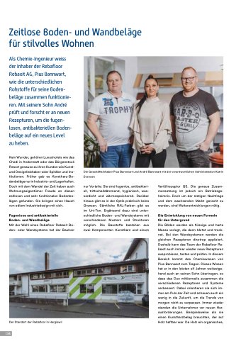 1514 Zeitlose Boden- und Wandbeläge für stilvolles Wohnen Als Chemie-Ingenieur weiss der Inhaber der Rebafloor Rebaxit AG, Pius Bannwart, wie die unterschiedlichen Rohstoffe für seine Boden- beläge zusammen funktionie- ren. Mit seinem Sohn André prüft und forscht er an neuen Rezepturen, um die fugen- losen, antibakteriellen Boden- beläge auf ein neues Level zu heben. Kein Wunder, gehören Luxushotels wie das Chedi in Andermatt oder das Bürgenstock Resort genauso zu ihren Kunden wie Kunst- und Designliebhaber oder Spitäler und Ins- titutionen. Früher gab es Kunstharz-Bo- denbeläge nur in Industrie- und Lagerhallen. Doch mit dem Wandel der Zeit haben auch Wohnungseigentümer Freude an diesen zeitlosen und sehr funktionalen Bodenbe- lägen gefunden. Sie bringen einen Hauch von edlem Industriedesign mit sich. Fugenlose und antibakterielle Boden- und Wandbeläge Mit der Wahl eines Rebafloor Rebaxit Bo- den- oder Wandsystems hat der Bauherr Die Geschäftsinhaber Pius Bannwart und André Bannwart mit der verantwortlichen Administration Katrin Evensen nur Vorteile: Sie sind fugenlos, antibakteri- ell, trittschalldämmend, hygienisch, was- serdicht und wärmespeichernd. Darüber hinaus gibt es in der Optik praktisch keine Grenzen. Sämtliche RAL-Farben gibt es im Uni-Ton. Ergänzend dazu sind unter- schiedliche Boden- und Wandsysteme mit verschiedenen Mustern und Strukturen möglich. Die Baustoffe bestehen aus zwei Komponenten Kunstharz und einem Verfüllrezeptor QS. Die genaue Zusam- mensetzung ist jedoch ein Betriebsge- heimnis. Doch um der stetigen Nachfrage und dem wachsenden Markt gerecht zu werden, sind Weiterentwicklungen nötig. Die Entwicklung von neuen Formeln für den Untergrund Die Böden werden als flüssige und harte Masse verlegt, die dann härtet und trock- net. Bei den Wandsystemen werden die gleichen Rezeptoren dixotrop appliziert. Deshalb kann das Team der Rebafloor Re- baxit auch immer wieder neue Rezepturen ausprobieren, testen und prüfen. In diesem Bereich kommt das Chemiewissen von Pius Bannwart zum Tragen. Dieses Wissen hat er in den letzten elf Jahren weitestge- hend auch an seinen Sohn übertragen, so dass das Duo mittlerweile zusammen die verschiedenen Rezeptoren und Systeme verbessert. Dabei orientieren sie sich im- mer am Puls der Zeit und schauen auch ein wenig in die Zukunft, um die Trends von morgen nicht zu verpassen. Immer wieder standen die Unternehmer vor neuen Her- ausforderungen. Beispielsweise als sie einen Kunstharzbelag brauchten, der auf Holz haftbar war. Da Holz ein organisches, Der Standort der Rebafloor in Hergiswil