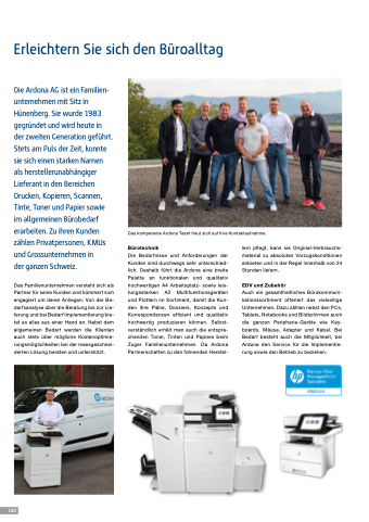 1610 Erleichtern Sie sich den Büroalltag Die Ardona AG ist ein Familien- unternehmen mit Sitz in Hünenberg. Sie wurde 1983 gegründet und wird heute in der zweiten Generation geführt. Stets am Puls der Zeit, konnte sie sich einen starken Namen als herstellerunabhängiger Lieferant in den Bereichen Drucken, Kopieren, Scannen, Tinte, Toner und Papier sowie im allgemeinen Bürobedarf erarbeiten. Zu ihren Kunden zählen Privatpersonen, KMUs und Grossunternehmen in der ganzen Schweiz. Das Familienunternehmen versteht sich als Partner für seine Kunden und kümmert sich engagiert um deren Anliegen: Von der Be- darfsanalyse über die Beratung bis zur Lie- ferung und bei Bedarf Implementierung bie- tet es alles aus einer Hand an. Nebst dem allgemeinen Bedarf werden die Klienten auch stets über mögliche Kostenoptimie- rungsmöglichkeiten bei der massgeschnei- derten Lösung beraten und unterstützt. Das kompetente Ardona Team freut sich auf Ihre Kontaktaufnahme. Bürotechnik Die Bedürfnisse und Anforderungen der Kunden sind durchwegs sehr unterschied- lich. Deshalb führt die Ardona eine breite Palette an funktionalen und qualitativ hochwertigen A4 Arbeitsplatz- sowie leis- tungsstarken A3 Multifunktionsgeräten und Plottern im Sortiment, damit die Kun- den ihre Pläne, Dossiers, Konzepte und Korrespondenzen effizient und qualitativ hochwertig produzieren können. Selbst- verständlich erhält man auch die entspre- chenden Toner, Tinten und Papiere beim Zuger Familienunternehmen. Da Ardona Partnerschaften zu den führenden Herstel- lern pflegt, kann sie Original-Verbrauchs- material zu absoluten Vorzugskonditionen anbieten und in der Regel innerhalb von 24 Stunden liefern. EDV und Zubehör Auch ein gesamtheitliches Bürokommuni- kationssortiment offeriert das vielseitige Unternehmen. Dazu zählen nebst den PCs, Tablets, Notebooks und Bildschirmen auch die ganzen Peripherie-Geräte wie Key- boards, Mäuse, Adapter und Kabel. Bei Bedarf besteht auch die Möglichkeit, bei Ardona den Service für die Implementie- rung sowie den Betrieb zu beziehen.