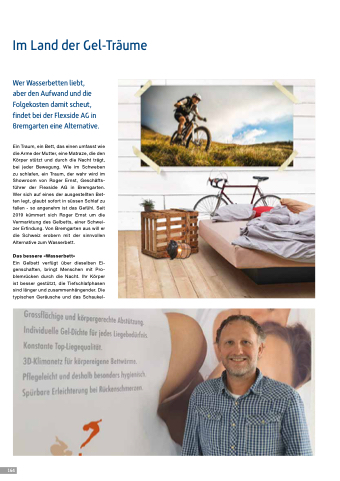 1614 Im Land der Gel-Träume Wer Wasserbetten liebt, aber den Aufwand und die Folgekosten damit scheut, findet bei der Flexside AG in Bremgarten eine Alternative. Ein Traum, ein Bett, das einen umfasst wie die Arme der Mutter, eine Matraze, die den Körper stützt und durch die Nacht trägt, bei jeder Bewegung. Wie im Schweben zu schlafen, ein Traum, der wahr wird im Showroom von Roger Ernst, Geschäfts- führer der Flexside AG in Bremgarten. Wer sich auf eines der ausgestellten Bet- ten legt, glaubt sofort in süssen Schlaf zu fallen - so angenehm ist das Gefühl. Seit 2019 kümmert sich Roger Ernst um die Vermarktung des Gelbetts, einer Schwei- zer Erfindung. Von Bremgarten aus will er die Schweiz erobern mit der sinnvollen Alternative zum Wasserbett. Das bessere «Wasserbett» Ein Gelbett verfügt über dieselben Ei- genschaften, bringt Menschen mit Pro- blemrücken durch die Nacht. Ihr Körper ist besser gestützt, die Tiefschlafphasen sind länger und zusammenhängender. Die typischen Geräusche und das Schaukel-