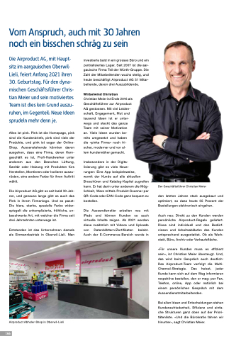 1616 Vom Anspruch, auch mit 30 Jahren noch ein bisschen schräg zu sein Die Airproduct AG, mit Haupt- sitz im aargauischen Oberwil- Lieli, feiert Anfang 2021 ihren 30. Geburtstag. Für den dyna- mischen Geschäftsführer Chris- tian Meier und sein motiviertes Team ist dies kein Grund auszu- ruhen, im Gegenteil: Neue Ideen sprudeln mehr denn je. Alles ist pink. Pink ist die Homepage, pink sind die Kundenbriefe, pink sind viele der Produkte, und pink ist sogar der Online- Shop. Aussenstehende könnten davon ausgehen, dass eine Firma, deren Kern- geschäft es ist, Profi-Handwerker unter anderem aus den Branchen Lüftung, Sanitär oder Heizung mit Produkten fürs Herstellen, Montieren oder Isolieren auszu- rüsten, eine andere Farbe für ihren Auftritt wählt. Die Airproduct AG gibt es seit bald 30 Jah- ren, und genauso lange gibt es auch das Pink in ihrem Firmenlogo. Und es passt: Die klare, starke, spezielle Farbe wider- spiegelt die unkomplizierte, fröhliche, un- beschwerte Art, mit welcher die Firma seit drei Jahrzehnten unterwegs ist. Entstanden ist das Unternehmen damals als Einmannbetrieb in Oberwil-Lieli. Man investierte bald in ein grosses Büro und ein zentralisiertes Lager. Seit 2007 ist die aar- gauische Firma Teil der Würth-Gruppe. Die Zahl der Mitarbeitenden wuchs stetig, und heute beschäftigt Airproduct AG 31 Mitar- beitende, davon drei Auszubildende. Wirbelwind Christian Christian Meier ist Ende 2016 als Geschäftsführer zur Airproduct AG gestossen. Mit viel Leiden- schaft, Engagement, Mut und tausend Ideen ist er unter- wegs und steckt das ganze Team mit seiner Motivation an. Viele Ideen wurden be- reits umgesetzt und haben die «pinke Firma» noch fri- scher, moderner und vor al- lem kundennäher gemacht. Insbesondere in der Digita- lisierung gibt es viele Neue- rungen: Eine App beispielsweise, womit der Kunde auf alle aktuellen Broschüren und Katalog-Kapitel zugreifen kann. Er hat darin unter anderem die Mög- lichkeit, Ware mittels Produkt-Scanner per QR-Code oder EAN-Code ganz bequem zu bestellen. Die Aussendienstler arbeiten neu mit iPads und können Kunden so auch virtuelle Inhalte zeigen. Ab 2021 werden diese zusätzlich mit Videos und Uploads von Datenblättern/Zertifikaten belebt. Auch der E-Commerce-Bereich wurde in Der Geschäftsführer Christian Meier den letzten Jahren stark ausgebaut und optimiert, so dass heute 35 Prozent der Bestellungen elektronisch eingehen. Auch neu: Direkt zu den Kunden werden persönliche Airproduct-Regale geliefert. Diese sind individuell und den Bedürf- nissen und Arbeitsabläufen des Kunden entsprechend ausgestattet. Ob als Werk- statt, Büro, Archiv oder Verkaufsfläche. «Für unsere Kunden muss es effizient sein», ist Christian Meier überzeugt. Und, das wird beim Gespräch auch deutlich: Das Airproduct-Team verfolgt die Multi- Channel-Strategie. Das heisst, jeder Kunde kann sich auf dem Weg informieren respektive bestellen, den er mag: per Fax, Telefon, online, App oder natürlich bei einem persönlichen Gespräch mit dem Aussendienstmitarbeitenden. Bei allen Ideen und Entscheidungen stehen Kundenzufriedenheit, Effizienz und einfa- che Strukturen ganz oben auf der Priori- tätenliste. «Und die Bürokratie fahren wir hinunter», sagt Christian Meier. Airproduct Abholer-Shop in Oberwil-Lieli