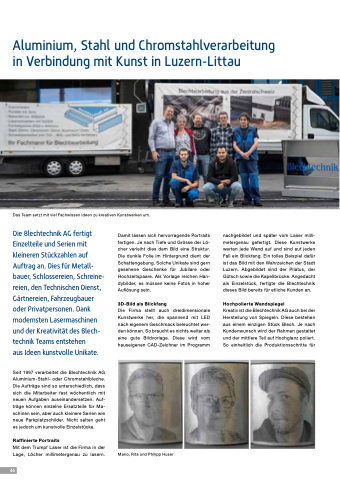 414 Aluminium, Stahl und Chromstahlverarbeitung in Verbindung mit Kunst in Luzern-Littau Das Team setzt mit viel Fachwissen Ideen zu kreativen Kunstwerken um. Die Blechtechnik AG fertigt Einzelteile und Serien mit kleineren Stückzahlen auf Auftrag an. Dies für Metall- bauer, Schlossereien, Schreine- reien, den Technischen Dienst, Gärtnereien, Fahrzeugbauer oder Privatpersonen. Dank modernsten Lasermaschinen und der Kreativität des Blech- technik Teams entstehen aus Ideen kunstvolle Unikate. Seit 1997 verarbeitet die Blechtechnik AG Aluminium-Stahl- oder Chromstahlbleche. Die Aufträge sind so unterschiedlich, dass sich die Mitarbeiter fast wöchentlich mit neuen Aufgaben auseinandersetzen. Auf- träge können einzelne Ersatzteile für Ma- schinen sein, aber auch kleinere Serien wie neue Parkplatzschilder. Nicht selten geht es jedoch um kunstvolle Einzelstücke. Raffinierte Portraits Mit dem Trumpf Laser ist die Firma in der Lage, Löcher millimetergenau zu lasern. Damit lassen sich hervorragende Portraits fertigen. Je nach Tiefe und Grösse der Lö- cher verleiht dies dem Bild eine Struktur. Die dunkle Folie im Hintergrund dient der Schattengebung. Solche Unikate sind gern gesehene Geschenke für Jubilare oder Hochzeitspaare. Als Vorlage reichen Han- dybilder, es müssen keine Fotos in hoher Auflösung sein. 3D-Bild als Blickfang Die Firma stellt auch dreidimensionale Kunstwerke her, die spannend mit LED nach eigenem Geschmack beleuchtet wer- den können. So braucht es nichts weiter als eine gute Bildvorlage. Diese wird vom hauseigenen CAD-Zeichner im Programm Mario, Rita und Philipp Huser nachgebildet und später vom Laser milli- metergenau gefertigt. Diese Kunstwerke werten jede Wand auf und sind auf jeden Fall ein Blickfang. Ein tolles Beispiel dafür ist das Bild mit den Wahrzeichen der Stadt Luzern. Abgebildet sind der Pilatus, der Gütsch sowie die Kapellbrücke. Angedacht als Einzelstück, fertigte die Blechtechnik dieses Bild bereits für etliche Kunden an. Hochpolierte Wandspiegel Kreativ ist die Blechtechnik AG auch bei der Herstellung von Spiegeln. Diese bestehen aus einem einzigen Stück Blech. Je nach Kundenwunsch wird der Rahmen gestaltet und der mittlere Teil auf Hochglanz poliert. So einheitlich die Produktionsschritte für