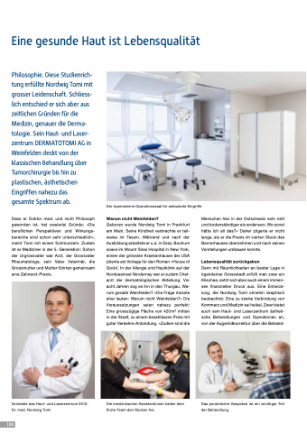 1014 Eine gesunde Haut ist Lebensqualität Philosophie. Diese Studienrich- tung erfüllte Nordwig Tomi mit grosser Leidenschaft. Schliess- lich entschied er sich aber aus zeitlichen Gründen für die Medizin, genauer die Derma- tologie. Sein Haut- und Laser- zentrum DERMATOTOMI AG in Weinfelden deckt von der klassischen Behandlung über Tumorchirurgie bis hin zu plastischen, ästhetischen Eingriffen nahezu das gesamte Spektrum ab. Dass er Doktor med. und nicht Philosoph geworden ist, hat zweierlei Gründe: «Die beruflichen Perspektiven und Wirkungs- bereiche sind schon sehr unterschiedlich», meint Tomi mit einem Schmunzeln. Zudem ist er Mediziner in der 5. Generation: Schon der Urgrossvater war Arzt, der Grossvater Rheumatologe, sein Vater Veterinär, die Grossmutter und Mutter führten gemeinsam eine Zahnarzt-Praxis. Gründete das Haut- und Laserzentrum 2012: Dr. med. Nordwig Tomi Der topmoderne Operationssaal für ambulante Eingriffe Warum nicht Weinfelden? Geboren wurde Nordwig Tomi in Frankfurt am Main. Seine Kindheit verbrachte er teil- weise im Tessin. Während und nach der Ausbildung arbeitete er u.a. in Graz, Bochum sowie im Mount Sinai Hospital in New York, einem der grössten Krankenhäuser der USA (diente als Vorlage für den Roman «House of God»). In der Allergie und Hautklinik auf der Nordseeinsel Norderney war er zudem Chef- arzt der dermatologischen Abteilung. Vor acht Jahren zog es ihn in den Thurgau. Wa- rum gerade Weinfelden? «Die Frage müsste eher lauten: Warum nicht Weinfelden?» Die Voraussetzungen seien nahezu perfekt: Eine grosszügige Fläche von 420 m2 mitten in der Stadt, zu einem bezahlbaren Preis mit guter Verkehrs-Anbindung. «Zudem sind die Menschen hier in der Ostschweiz sehr nett und bodenständiger als anderswo. Wo sonst hätte ich all das?» Daher zögerte er nicht lange, als er die Praxis im vierten Stock des Bernerhauses übernehmen und nach seinen Vorstellungen umbauen konnte. Lebensqualität zurückgeben Denn mit Räumlichkeiten an bester Lage in irgendeiner Grossstadt erfüllt man zwar ein Klischee, setzt sich aber auch einem immen- sen finanziellen Druck aus. Eine Entwick- lung, die Nordwig Tomi ohnehin skeptisch beobachtet: Eine zu starke Verbindung von Kommerz und Medizin sei heikel. Zwar bietet auch sein Haut- und Laserzentrum ästheti- sche Behandlungen und Operationen an, von der Augenlidkorrektur über die Behand- Die medizinischen Assistentinnen halten dem Ärzte-Team den Rücken frei. Das persönliche Gespräch ist ein wichtiger Teil der Behandlung.