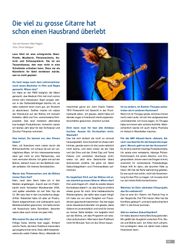 Die viel zu grosse Gitarre hat schon einen Hausbrand überlebt Text und Interview: Rahel Hegglin Fotos: Simon Habegger Lara Stoll ist eine erfolgreiche Slam- Poetin, Musikerin, Filmemacherin, Au- torin und Schauspielerin. Sie ist ein Tausendsassa, den man nicht in eine Schublade schieben kann. Dass sie als Künstlerin ihr Geld verdienen würde, war so nicht geplant. Du hast lange nach dem Lehrerseminar noch einen Bachelor in Film und Regie gemacht. Wieso das? Ich habe an der PMS lediglich die Matur gemacht, das Medium Film hat mich schon immer sehr interessiert. Nach einigen Jah- ren in der Selbstständikgeit dachte ich, es wäre vielleicht doch noch gut, ein Studium zu absolvieren. Seither mache ich neben der Kleinkunst auf der Bühne mit meinem Kollektiv «Bild und Ton» verschiedene Film- projekte. Das sind meistens alternative low-budget Produktionen, immerhin waren wir letztes Jahr aber für den Schweizer und Zürcher Filmpreis nominiert. Das heisst, Du kannst von den Filmen leben? Nein, ich finanziere mein Leben durch die Bühnenauftritte. Ich schaue da auf ein ver- trägliches Mass. Ich bin interessanterweise eben gar nicht so eine Rampensau, wie man vermuten könnte. Ich gebe viel auf der Bühne, danach muss ich die Batterien wie- der aufladen. Ein kleines Sensibelchen. Waren das Filmemachen und die Bühne immer Dein Ziel? Nein, nach dem Semi habe ich in den Medien angefangen. Zuerst war ich Prakti- kantin beim Schweizer Musiksender VIVA, und später arbeitete ich bei Tele Top als VJ. Bin also fast in den Journalismus abge- driftet. Nebenbei habe ich aber an Poetry- Slams teilgenommen und schliesslich auch Meisterschaften gewonnen. Ich hatte immer viel Ausschuss beim Schreiben, darunter waren aber auch immer ein paar Hits. Wie meinst Du das mit den Hits? Hittige Texte, könnte man sagen. Einfach solche Texte, die beim Publikum besonders gut angekommen sind. Dazu zählt beispiels- weise die uralte Trekker-Story «Weshalb ich manchmal gerne ein John Deere Traktor 7810 Powershift mit Gewicht in der Front- hydraulik wäre». Ich glaube, damit habe ich damals sogar in Frankreich die Europameis- terschaften gewonnen, ziemlich surreal. Dich kann man für fast alle Anlässe buchen. Ausser für Hochzeiten nicht. Weshalb? Das hat sich einfach als nicht so sinnvoll herausgestellt. Eine Hochzeit ist etwas sehr Intimes, gerade wenn ich die Leute natürlich nicht kenne, und dann sitzen da der Opa und die Oma und der Onkel Sigi und Tante Helene und verstehen überhaupt nicht, wieso ich jetzt eine Geschichte übers Schnarchen erzähle. Da gehe ich lieber Geburtstagsfeiern und Firmenanlässe auf- mischen. Du begleitest Dich auf der Bühne mit ei- ner ziemlich grossen Gitarre. Wieso das? Die Leute fragen oft: «Hast du wieder diesen Kontrabass dabei?» Ja, das Ding ist wirklich etwas gross für mich. Eine halbakustische Westerngitarre, die dafür aber super klingt! Ich habe sie vor einer Ewigkeit von Freun- dinnen geschenkt bekommen. Sie hat sogar einen Hausbrand überlebt. Ich glaube, diese Gitarre ist unverwüstlich und wird für immer an meiner Seite bleiben. Ich begleite mich auf der Bühne, um das Programm ein biss- chen aufzulockern. Man kann dem Publikum nicht 90 Minuten Text um die Ohren hauen. Ist es anders, im Kanton Thurgau aufzu- treten als in anderen Kantonen? Wenn ich im Thurgau spiele, kommen immer recht viele Leute. Ich bin hier aufgewachsen und bekannter. Ich muss sagen, im Thurgau habe ich immer sehr schöne Auftritte. Wahr- scheinlich werde ich auch meine Premiere im Herbst in Weinfelden machen. Für die SRF Advent-Serie «Advent, Ad- vent» wurdest Du für die Hauptrolle enga- giert. Worum geht es bei der Kurzserie? Es ist eine ziemlich trashige Polizeikomödie. Ich spiele eine verkaterte, hässige Polizei- Kommissarin mit einem Alkohol- und Dro- genproblem. Immer wenn sie Drogen nimmt, erscheint ihr verstorbener Polizeikollege. Dieser hilft ihr dann, die skurrilen Fälle zu lösen. Mir hat die Rolle wahnsinnig gefallen. Es war auch mal schön, nicht die Verantwor- tung für den Film zu tragen. Ich musste mich nur auf meine Rolle konzentrieren. Welches ist Dein nächstes Filmprojekt, das Du realisierst? Das ist eine Art «Tatort» mit Patrick Frey in der Hauptrolle. Der Film heisst «Wer hat die Konfitüre geklaut?» und wird wahrscheinlich 2021 in die Kinos kommen. Gibt es weitere Zukunftspläne? Ich habe absolut meine Berufung gefunden. Mir gefällt der Ausgleich zwischen Film, Mu- sik und Bühne sehr. Ich fühle mich unheim- lich privilegiert, dass ich damit mein Leben finanzieren kann. 1241