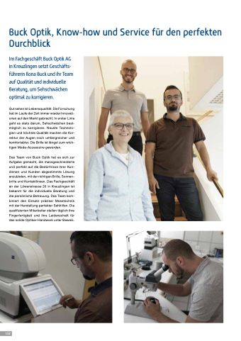 1512 Buck Optik, Know-how und Service für den perfekten Durchblick Im Fachgeschäft Buck Optik AG in Kreuzlingen setzt Geschäfts- führerin Ilona Buck und ihr Team auf Qualität und individuelle Beratung, um Sehschwächen optimal zu korrigieren. Gut sehen ist Lebensqualität. Die Forschung hat im Laufe der Zeit immer wieder Innovati- onen auf den Markt gebracht. In erster Linie geht es stets darum, Sehschwächen best- möglich zu korrigieren. Neuste Technolo- gien und höchste Qualität machen die Kor- rektur der Augen noch umfangreicher und komfortabler. Die Brille ist längst zum wich- tigen Mode-Accessoire geworden. Das Team von Buck Optik hat es sich zur Aufgabe gemacht, die massgeschneiderte und perfekt auf die Bedürfnisse ihrer Kun- dinnen und Kunden abgestimmte Lösung anzubieten, mit der richtigen Brille, Sonnen- brille und Kontaktlinsen. Das Fachgeschäft an der Löwenstrasse 26 in Kreuzlingen ist bekannt für die individuelle Beratung und die persönliche Betreuung. Das Team kom- biniert den Einsatz präziser Messtechnik mit der Herstellung perfekter Sehhilfen. Die qualifizierten Mitarbeiter stellen täglich ihre Fingerfertigkeit und ihre Leidenschaft für das solide Optiker-Handwerk unter Beweis.