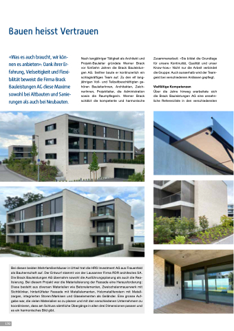 Bei diesen beiden Mehrfamilienhäuser in Uttwil trat die HRS Investment AG aus Frauenfeld als Bauherrschaft auf. Der Entwurf stammt von der Lausanner Firma RDR architectes SA. Die Brack Bauleistungen AG übernahm sowohl die Ausführungsplanung als auch die Rea- lisierung. Bei diesem Projekt war die Materialisierung der Fassade eine Herausforderung: Diese besteht aus diversen Materialien wie Betonelementen, Zweischalenmauerwerk mit Sichtklinker, hinterlüfteter Fassade mit Metallelementen, Holzmetallfenstern mit Metall- zargen, integrierten Storen/Markisen und Glaselementen als Geländer. Eine grosse Auf- gabe war, die vielen Materialien so zu planen und mit den verschiedenen Unternehmern zu koordinieren, dass am Schluss sämtliche Übergänge in allen drei Dimensionen passen und es ein harmonisches Bild gibt. 1710 Bauen heisst Vertrauen «Was es auch braucht, wir kön- nen es anbieten»: Dank ihrer Er- fahrung, Vielseitigkeit und Flexi- bilität beweist die Firma Brack Bauleistungen AG diese Maxime sowohl bei Altbauten und Sanie- rungen als auch bei Neubauten. Nach langjähriger Tätigkeit als Architekt und Projekt-Bauleiter gründete Werner Brack vor fünfzehn Jahren die Brack Bauleistun- gen AG. Seither baute er kontinuierlich ein schlagkräftiges Team auf. Zu den elf lang- jährigen Voll- und Teilzeitbeschäftigten ge- hören BauleiterInnen, Architekten, Zeich- nerInnen, Projektleiter, die Administration sowie die Raumpflegerin. Werner Brack schätzt die kompetente und harmonische Zusammenarbeit: «Sie bildet die Grundlage für unsere Kontinuität, Qualität und unser Know-how.» Nicht nur die Arbeit verbindet die Gruppe: Auch ausserhalb wird der Team- geist bei verschiedenen Anlässen gepflegt. Vielfältige Kompetenzen Über die Jahre hinweg erarbeitete sich die Brack Bauleistungen AG eine ansehn- liche Referenzliste in den verschiedensten