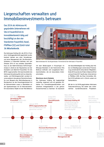 214 Liegenschaften verwalten und Immobilieninvestments betreuen Das 2014 als Admicasa AG gegründete Unternehmen mit Sitz in Frauenfeld ist im Immobilienbereich tätig und beschäftigt an den vier Standorten Frauenfeld, Basel, Pfäffikon (SZ) und Zürich total 36 Mitarbeitende. Die Admicasa Holding AG, die 2016 in Form einer Holdinggesellschaft gegründet wurde, bestand damals aus einer Verwaltungs- und einer Management AG. Die Büroräum- lichkeiten in Frauenfeld befinden sich seit Oktober 2014 im neu erstellen Geschäfts- haus an der Bahnhofstrasse 92/Erchinger- strasse 3, direkt an der Hauptachse von der Autobahn zum Bahnhof Frauenfeld. Für die BFW Liegenschaften AG bewirtschaftet die Admicasa Verwaltung AG nicht nur diese Ge- werbe- und Wohnliegenschaft, sondern di- verse weitere in der ganzen Deutschschweiz. So zum Beispiel eine Wohnüberbauung in Romanshorn an der Kreuzlingerstrasse mit 36 Wohneinheiten sowie in Weinfelden an der Egelseestrasse mit 32 Wohneinheiten. Ein besonderes Objekt ist die Villa Bellevue Bahnhofstrasse 92 / Erchingerstrasse: Firmendomizil der Admicasa in Frauenfeld mit dem Bellevuepark in Kreuzlingen im Minergie-Standard. In der historischen Villa Bellevue befinden sich ausgebaute Büro- räumlichkeiten, die ein besonderes Ambi- ente bieten. Wachstum durch Zukäufe Die Admicasa Holding AG beabsichtigt zukünftig, organisch und mit gezielten Zu- käufen von Immobiliengesellschaften und lukrativen Anlageobjekten in der ganzen Deutschschweiz zu wachsen. So bezweckt die Geschäftstätigkeit der Holding das Hal- ten von Beteiligungen sowie deren Finanzie- rung und alle damit verbundenen Tätigkeiten. Ende 2015 wurde eine Filiale in Basel eröffnet und per Ende 2017 kaufte das Unternehmen in Pfäffikon (SZ) die Etzel Immobilien AG. Seit 2019 befindet sich in Zürich zudem ein Verkaufsbüro. Mit der im Juli 2018 gegründeten Admicasa Totalunternehmung AG bietet das Unter- nehmen kundenfokussierte Projektent-