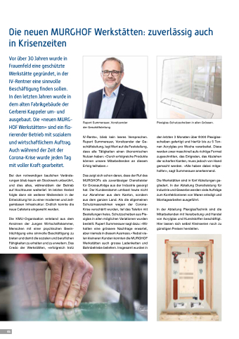 416 Die neuen MURGHOF Werkstätten: zuverlässig auch in Krisenzeiten Vor über 30 Jahren wurde in Frauenfeld eine geschützte Werkstätte gegründet, in der IV-Rentner eine sinnvolle Beschäftigung finden sollen. In den letzten Jahren wurde in dem alten Fabrikgebäude der Gerberei Kappeler um- und ausgebaut. Die «neuen MURG- HOF Werkstätten» sind ein flo- rierender Betrieb mit sozialem und wirtschaftlichem Auftrag. Auch während der Zeit der Corona-Krise wurde jeden Tag mit voller Kraft gearbeitet. Bei den notwendigen baulichen Verände- rungen blieb kaum ein Stockwerk unberührt, und dies alles, währenddem der Betrieb auf Hochtouren weiterlief. Im letzten Herbst folgte dann ein weiterer Meilenstein in der Entwicklung hin zu einer modernen und zeit- gemässen Infrastruktur: Endlich konnte die neue Cafeteria eingeweiht werden. Die KMU-Organisation entstand aus dem Ansinnen der Jungen Wirtschaftskammer, Menschen mit einer psychischen Beein- trächtigung eine sinnvolle Beschäftigung zu bieten und damit die sozialen und beruflichen Fähigkeiten zu erhalten und zu erweitern. Das Credo der Werkstätten, «erfolgreich trotz Rupert Summerauer, Vorsitzender der Geschäftsleitung IV-Rente», blieb kein leeres Versprechen. Rupert Summerauer, Vorsitzender der Ge- schäftsleitung, legt Wert auf die Feststellung, dass alle Tätigkeiten einen ökonomischen Nutzen haben: «Durch erfolgreiche Produkte können unsere Mitarbeitenden an diesem Erfolg teilhaben.» Das zeigt sich schon daran, dass der Ruf des MURGHOFs als zuverlässiger Dienstleister für Grossaufträge aus der Industrie gesorgt hat. Der Kundenstamm umfasst heute nicht nur Abnehmer aus dem Kanton, sondern aus dem ganzen Land. Als die allgemeinen Schutzmassnahmen wegen der Corona- Krise verschärft wurden, lief das Telefon mit Bestellungen heiss. Schutzscheiben aus Ple- xiglas in allen möglichen Variationen wurden bestellt. Rupert Summerauer sagt dazu: «Wir hatten eine grössere Nachfrage erwartet, aber niemals in diesem Ausmass.» Nebst vie- len kleineren Kunden konnten die MURGHOF Werkstätten auch grosse Ladenketten und Bahnbetriebe beliefern. Insgesamt wurden in Plexiglas-Schutzscheiben in allen Grössen. den letzten 3 Monaten über 8000 Plexiglas- scheiben gefertigt und hierfür bis zu 5 Ton- nen Acrylglas pro Woche verarbeitet. Diese werden zwar maschinell aufs richtige Format zugeschnitten, das Entgraten, das Abziehen der scharfen Kanten, muss jedoch von Hand gemacht werden. «Alle haben dabei mitge- holfen», sagt Summerauer anerkennend. Die Werkstätten sind in fünf Abteilungen ge- gliedert. In der Abteilung Dienstleistung für Industrie und Gewerbe werden viele Aufträge zum Konfektionieren von Waren erledigt und Montagearbeiten ausgeführt. In der Abteilung PlexiglasTechnik sind die Mitarbeitenden mit Verarbeitung und Handel von Acrylglas und Kunststoffen beschäftigt. Hier lassen sich selbst Kleinserien noch zu günstigen Preisen herstellen.