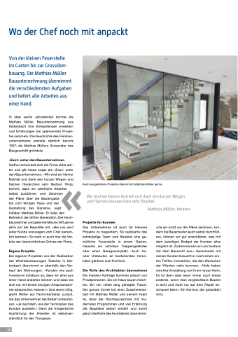 712 Wo der Chef noch mit anpackt Von der kleinen Feuerstelle im Garten bis zur Grossüber- bauung: Die Mathias Müller Bauunternehmung übernimmt die verschiedensten Aufgaben und liefert alle Arbeiten aus einer Hand. In über sechs Jahrzehnten konnte die Mathias Müller Bauunternehmung aus Kaltenbach ihre Kompetenzen erweitern und Erfahrungen bei spannenden Projek- ten sammeln. Die Geschichte des Familien- unternehmens startete nämlich bereits 1957, als Mathias Müllers Grossvater das Baugeschäft gründete. «Exot» unter den Bauunternehmen Seither entwickelt sich die Firma stets wei- ter und gilt heute sogar als «Exot» unter den Bauunternehmen. «Wir sind ein kleiner Betrieb und dank den kurzen Wegen und flachen Hierarchien sehr flexibel. Hinzu kommt, dass wir sämtliche Arbeiten selbst ausführen: vom Zeichnen der Pläne über die Baueingabe bis zum fertigen Haus und der Gestaltung des Gartens», sagt Inhaber Mathias Müller. Er leitet den Betrieb in der dritten Generation. Der Hoch- bauzeichner und gelernte Maurer hilft gerne aktiv auf der Baustelle mit. «Bei uns wird jeder Kunde sozusagen vom Chef persön- lich betreut.» So sieht er auch hier die Vor- teile der übersichtlichen Grösse der Firma. Eigene Projekte Bei eigenen Projekten wie der Realisation der Wohnüberbauungen Talacker in Kal- tenbach übernimmt er ebenfalls den Ver- kauf der Wohnungen. «Kunden wie auch Investoren schätzen es, dass wir alles aus einer Hand anbieten können und dass sie sich nur mit einem einzigen Ansprechpart- ner absprechen müssen.» Und wenn nötig, greift Müller auf Fachmitarbeiter zurück, die das Unternehmen bei Bedarf unterstüt- zen. «Je nachdem, wie der Terminplan des Kunden aussieht.» Denn die fristgerechte Ausführung der Arbeiten ist selbstver- ständlich für den Thurgauer. Auch ausgefallene Projekte übernimmt Mathias Müller gerne. Wir sind ein kleiner Betrieb und dank den kurzen Wegen und flachen Hieararchien sehr flexibel. Projekte für Kunden Das Unternehmen ist auch für kleinere Projekte zu begeistern. So realisierte das zehnköpfige Team zum Beispiel eine ge- mütliche Feuerstelle in einem Garten, mauerte ein schickes Treppengeländer oder einen Garagenvorplatz. Auch An- oder Umbauten an bestehenden Immo- bilien gehören zum Portfolio. Die Rolle des Architekten übernehmen Die meisten Aufträge kommen jedoch von Privatpersonen, die ein Haus bauen möch- ten. Ein von vielen lang gehegter Traum. Der grosse Vorteil bei einer Zusammenar- beit mit Mathias Müller und seinem Team ist, dass der Hochbauzeichner mit mo- dernsten Programmen und viel Erfahrung die Baupläne selbst erstellt und somit gleich die Rolle des Architekten übernimmt. Mathias Müller, Inhaber «Da wir nicht nur die Pläne zeichnen, son- dern die Bauarbeiten auch selbst durchfüh- ren, können wir gut einschätzen, was mit dem jeweiligen Budget der Kunden alles möglich ist. Zudem kennen wir uns bestens mit dem Baurecht aus.» Gemeinsam mit seinen Kunden besucht er nach einem ers- ten Treffen Immobilien, die den Wünschen der Klienten nahe kommen. «Viele haben eine fixe Vorstellung von ihrem neuen Heim. Es ist dann aber eben immer noch etwas anderes, wenn man vergleichbare Bauten in echt und nicht nur auf dem Papier an- schauen kann.» Ein Service, der geschätzt wird.