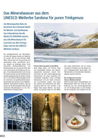 1012 Das Mineralwasser aus dem UNESCO-Welterbe Sardona für puren Trinkgenuss Die Mineralquellen Mels AG bereichert den Schweizer Markt für Mineral- und Quellwasser. Das Unternehmen hat die Marke PIZ SARDONA lanciert, das edle Mineralwasser für Gourmets aus dem Hochge- birge rund um das UNESCO- Welterbe Sardona. Die Erfolgsgeschichte der Mineralquel- len Mels AG begann bereits vor Millionen von Jahren. Bis die drei Gründer, Malte Mack, Daniel Vogt und Thomas Enge ihre gemeinsame Vision verwirklichen konn- ten, dauerte es allerdings etwas. Zuvor erforschten Wissenschaftlerinnen und Wissenschaftler aus der ganzen Welt über zwei Jahrhunderte die Entstehung der Al- pen. In der Gebirgslandschaft rund um den Piz Sardona kamen sie dem Geheimnis der Entstehungsgeschichte auf die Spur. Genau dort, in der intakten Melser Bergwelt, einer der schönsten und spektakulärsten Alpen- landschaften der Schweiz, beim UNESCO- Welterbe Tektonikarena Sardone, liegt die Quelle, die der Mineralquellen Mels AG das natürlichen Mineralwassers für ihre Pro- duktemarke Piz Sardona liefert. Frische Ideen sprudeln um die Wette Neue Wege gehen, mit frischen Ideen und nachhaltigem Denken, den Mineral- wassermarkt bereichern, sowohl Fein- schmecker wie auch ernährungsbewusste Konsumenten mit einem basischen Mi- neralwasser begeistern sowie unnötigen Wasserimport und den damit verbunde- nen CO2-Ausstoss senken: Das waren die Visionen des Gründertrios der Mine- ralquellen Mels AG. Nun sprudelt in der Region Mels bestes Mineral- und Quell- wasser mit grossen Ideen um die Wette. Das junge Unternehmen hat mit seinen innovativen Produkten aus der Region be- reits Erfolgsgeschichte geschrieben und Marktanteile von internationalen Getränke- giganten gewinnen können. Der Trinkgenuss aus dem Unesco-Welterbe-Gebiet Malte Christian Mack, Geschäftsleiter der Mineralquellen Mels AG, bringt 28 Jahre Erfahrung aus dem Konsumgüterbereich mit. Der 55-jährige Vater von drei Kindern hat sein Handwerk unter anderem bei den