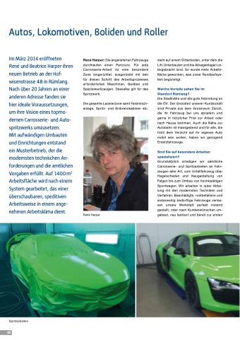 Autos, Lokomotiven, Boliden und Roller Im März 2014 eröffneten René und Beatrice Harper ihren neuen Betrieb an der Hof- wisenstrasse 48 in Rümlang. Nach über 20 Jahren an einer anderen Adresse fanden sie hier ideale Voraussetzungen, um ihre Vision eines topmo- dernen Carrosserie- und Auto- spritzwerks umzusetzen. Mit aufwändigen Umbauten und Einrichtungen entstand ein Musterbetrieb, der die modernsten technischen An- forderungen und die amtlichen Vorgaben erfüllt. Auf 1400 m2 Arbeitsfläche wird nach einem System gearbeitet, das einer überschaubaren, speditiven Arbeitsweise in einem ange- nehmen Arbeitsklima dient. René Harper: Die angelieferten Fahrzeuge durchlaufen einen Parcours. Für jede Carrosserie-Arbeit ist eine besondere Zone eingerichtet, ausgerüstet mit den für diesen Schritt des Arbeitsprozesses erforderlichen Maschinen, Geräten und Spezialwerkzeugen. Dasselbe gilt für das Spritzwerk. Die gesamte Lackierzone samt Farbmisch- anlage, Spritz- und Einbrennkabinen etc. René Harper steht auf einem Gitterboden, unter dem die Lift-Unterbauten und die Absaganlagen un- tergebracht sind. So wurde mehr Arbeits- fläche gewonnen, was unser Rundlaufsys- tem begünstigt. Welche Vorteile sehen Sie im Standort Rümlang? Die Stadtnähe und die gute Anbindung an die ÖV. Der Grossteil unserer Kundschaft sind Private aus dem Grossraum Zürich, die ihr Fahrzeug bei uns abliefern und gerne in nützlicher Frist zur Arbeit oder nach Hause kommen. Auch die Nähe zur Autobahn ist massgebend und für alle, die trotz dem Verzicht auf ihr eigenes Auto mobil sein wollen, haben wir genügend Ersatzfahrzeuge. Sind Sie auf besondere Arbeiten spezialisiert? Grundsätzlich erledigen wir sämtliche Carrosserie- und Spritzarbeiten an Fahr- zeugen aller Art, vom Unfallfahrzeug über Hagelschaden und Neugestaltung von Felgen bis zum Umbau von hochkarätigen Sportwagen. Wir arbeiten in jeder Abtei- lung mit den modernsten Techniken und Verfahren. Beschädigte, rostbefallene und anderweitig bedürftige Fahrzeuge verlas- sen unsere Werkstatt perfekt instand gestellt, oder nach Kundenwünschen um- gebaut, neu lackiert und bereit zur ersten 418 Spritzarbeiten
