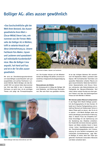 «Das Durchschnittliche gibt der Welt ihren Bestand, das Ausser- gewöhnliche ihren Wert.» (Oscar Wilde) Dieser Satz, ent- nommen von der Firmen-Web- seite der Bolliger AG in Wohlen, trifft in vielerlei Hinsicht auf diese Unternehmung zu. Unsere Fachleute fürs Malen, Gipsen und Lackieren sind spezialisiert auf individuelle Kundenbedürf- nisse. Was die Bolliger-Crew anpackt, hat Hand und Fuss und ist in der Tat alles ausser gewöhnlich.
