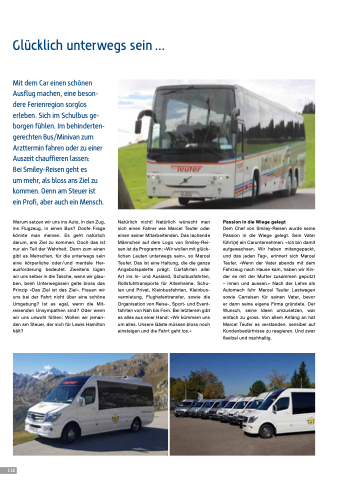 Natürlich nicht! Natürlich wünscht man sich einen Fahrer wie Marcel Teufer oder einen seiner Mitarbeitenden. Das lachende Männchen auf dem Logo von Smiley-Rei- sen ist da Programm: «Wir wollen mit glück- lichen Leuten unterwegs sein», so Marcel Teufer. Das ist eine Haltung, die die ganze Angebotspalette prägt: Carfahrten aller Art ins In- und Ausland, Schulbusfahrten, Rollstuhltransporte für Altenheime, Schu- len und Privat, Kleinbusfahrten, Kleinbus- vermietung, Flughafentransfer, sowie die Organisation von Reise-, Sport- und Event- fahrten von Nah bis Fern. Bei letzterem gibt es alles aus einer Hand: «Wir kümmern uns um alles. Unsere Gäste müssen bloss noch einsteigen und die Fahrt geht los.»