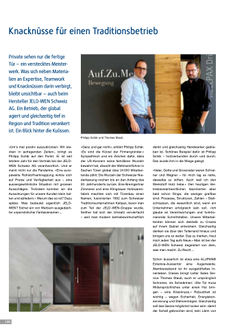 «Vater, Gotte und Grossvater waren Schrei- ner und Wagner – für mich lag es nahe, dasselbe zu stiften. Auch weil ich den Werkstoff Holz liebe.» Den heutigen Ver- triebsverantwortlichen faszinierten aber bald schon Dinge, die weniger greifbar sind: Prozesse, Strukturen, Zahlen – Stell- schrauben, die wesentlich sind, wenn ein Unternehmen erfolgreich sein soll. «Ich glaube an Verantwortungen und funktio- nierende Schnittstellen. Unsere Mitarbei- tenden können sich deshalb zu Cracks auf ihrem Gebiet entwickeln. Gleichzeitig denken sie über den Tellerrand hinaus und bringen uns so weiter. Das zu merken, freut mich jeden Tag aufs Neue.» Man ist bei der JELD-WEN Schweiz begeistert von dem, was man macht. Zu Recht ...