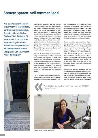 Was darf ich abziehen? Wie hole ich das Optimum heraus? Solche Knacknüsse sor- gen bei den meisten für schlaflose Nächte, bei Corinne Bircher, der Inhaberin von Bir- cher Treuhand, nicht. Im Gegenteil: Seit über 20 Jahren kümmert sie sich um KMUs. Revisonen, Treuhand, Finanzen, Payroll und Steuern gehören zum Dienstleistungsbe- reich. Sie tut das mit Talent, einem reich- gefüllten beruflichen Rucksack und Leiden- schaft. Davon profitieren auch zahlreiche Privatkunden: «Ich fülle unglaublich gern Steuererklärungen aus, liebe Zahlen und komplexe Herausforderungen.»
