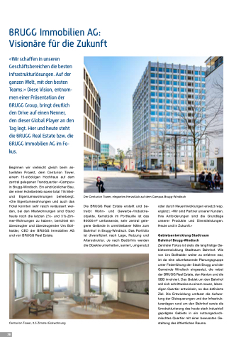 «Wir schaffen in unseren Geschäftsbereichen die besten Infrastrukturlösungen. Auf der ganzen Welt, mit den besten Teams.» Diese Vision, entnom- men einer Präsentation der BRUGG Group, bringt deutlich den Drive auf einen Nenner, den dieser Global Player an den Tag legt. Hier und heute steht die BRUGG Real Estate bzw. die BRUGG Immobilien AG im Fo- kus.
