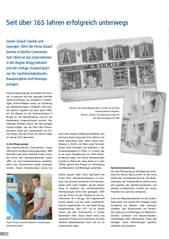 Daniel Zulauf zeigt der Journalistin ein Inse- rat, in welchem sich der Spengler Gottlieb Zulauf aus Brugg «zur Installation vollstän- diger Closet-Anlagen sowie zur Erstellung der Wasserleitungen» empfiehlt. Das Inse- rat stammt ungefähr aus dem Jahre 1896, als die Häuser an der Aarauerstrasse in Brugg an die Wasserleitung und an die Kanalisation angeschlossen wurden. Der Spengler Gottlieb Zulauf, der das besagte Inserat aufgab, war der Sohn des Firmen- gründers sowie der Urgrossvater von Da- niel Zulauf, der die Firma von seinem Vater im Januar 2017 übernahm.