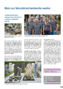 Das Bildhaueratelier Meier in Brugg ist nicht nur der richtige Partner für Grabsteine, sondern auch für Natursteinbrunnen. Inha- ber und Geschäftsführer Remo Streit fährt in verschiedene Steinbrüche, um für seine Kunden die schönsten Natursteine auszu- suchen. Daraus fertigen die Spezialisten individuelle Brunnen, die für ein wunderba- res Ambiente im Garten sorgen. Das Plät- schern des Wassers wirkt beruhigend, und während der warmen Jahreszeit gibt es, nicht nur für die Kleinen, nichts Schöneres, als in den Brunnen zu sitzen und sich eine herrliche Abkühlung zu gönnen. Damit der Kunde ein Leben lang Freude an diesem Schmuckstück im Garten hat, kümmert sich die Bildhauerei Meier auch um das Entkalken und Reinigen des Brunnens so- wie um die Wartung der Pumpe.