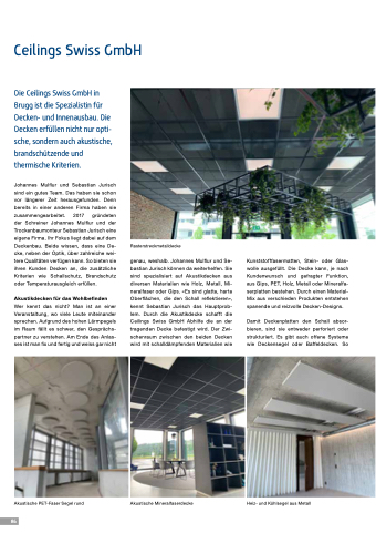 genau, weshalb. Johannes Mulflur und Se- bastian Jurisch können da weiterhelfen. Sie sind spezialisiert auf Akustikdecken aus diversen Materialien wie Holz, Metall, Mi- neralfaser oder Gips. «Es sind glatte, harte Oberflächen, die den Schall reflektieren», kennt Sebastian Jurisch das Hauptprob- lem. Durch die Akustikdecke schafft die Ceilings Swiss GmbH Abhilfe die an der tragenden Decke befestigt wird. Der Zwi- schenraum zwischen den beiden Decken wird mit schalldämpfenden Materialien wie