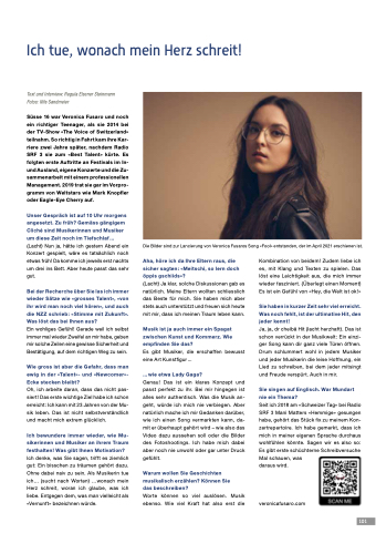 Süsse 16 war Veronica Fusaro und noch ein richtiger Teenager, als sie 2014 bei der TV-Show «The Voice of Switzerland» teilnahm. So richtig in Fahrt kam ihre Kar- riere zwei Jahre später, nachdem Radio SRF 3 sie zum «Best Talent» kürte. Es folgten erste Auftritte an Festivals im In- und Ausland, eigene Konzerte und die Zu- sammenarbeit mit einem professionellen Management. 2019 trat sie gar im Vorpro- gramm von Weltstars wie Mark Knopfler oder Eagle-Eye Cherry auf.