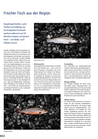 Das Seitenband der Regenbogenforelle schillert in allen Farben des Regenbogens – daher kommt auch ihr Name. Ihr Fleisch ist zart und dennoch fest, und eignet sich be- sonders für leichte Gerichte. Das Buchen- holz in der Räucherkammer verleiht der «Rubiger Forelle» eine dezente Rauchnote.