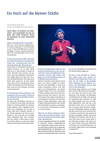 Du bist auf der ganzen Welt unterwegs und trittst mit deutschen und englischen Texten auf – manchmal aber auch mit schweizerdeutschen. Wie geht das? Früher habe ich international meistens auf englisch performt. Vor ein paar Jahren habe ich es in Tokio einfach so einmal mit einem deutschen Text versucht, und ge- merkt, dass das tatsächlich funktionieren kann! Später habe ich in New York mit ei- nem schweizerdeutschen Text sogar einen Poetry Slam gewonnen. Es gibt einfach Texte, die nur schon vom Klang her funkti- onieren. Wir wachsen ja auch mit Musik auf, deren Texte wir nicht verstehen. Das finde ich sehr spannend!