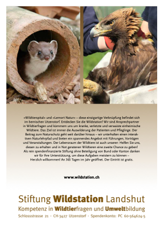 «Wildtierspital» und «Lernort Natur» – diese einzigartige Verknüpfung befindet sich im bernischen Utzenstorf. Entdecken Sie die Wildstation! Wir sind Ansprechpartner in Wildtierfragen und kümmern uns um kranke, verletzte und verwaiste einheimische Wildtiere. Das Ziel ist immer die Auswilderung der Patienten und Pfleglinge. Der Beitrag zum Naturschutz geht weit darüber hinaus – wir unterhalten einen interak- tiven Naturlehrpfad und bieten ein spannendes Angebot mit Führungen, Vorträgen und Veranstaltungen. Der Lebensraum der Wildtiere ist auch unserer: Helfen Sie uns, diesen zu erhalten und in Not geratenen Wildtieren eine zweite Chance zu geben! Als rein spendenfinanzierte Stiftung ohne Beteiligung von Bund oder Kanton danken wir für Ihre Unterstützung, um diese Aufgaben meistern zu können – Herzlich willkommen! An 365 Tagen im Jahr geöffnet. Der Eintritt ist gratis.