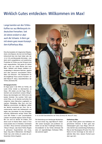 Zu jeder Filiale gehört eine Kaffeebar mit gemütlicher Sitzecke. In Bern geht man diesbezüglich ganz neue Wege: 2019 öff- nete nämlich das zweitstöckige Kaffeehaus Max an der Neuengasse 39 seine Tore. Der Name ist eine Hommage an den oben er- wähnten Max Herz, dessen Portrait auch das Logo ziert.