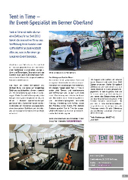 Ein solides, breit gefächertes Sortiment an eigenem Eventmaterial und die Zusam- menarbeit mit zuverlässigen Partnerfirmen. Mit diesem Rezept setzt Tent in Time in erster Linie Firmen- und Vereinsevents oder Eröffnungen um, ist aber auch stark in der Realisierung von privaten Anlässen wie Hochzeiten oder Geburtstagsfesten. Das Dienstleistungsangebot beinhaltet Planung, Anlieferung und Aufbau sowie den Rückbau eines Events. Für kleinere Budgets gewährt Tent in Time bei ausge- wählten Produkten auch einen sehr interes- santen Selbstabholerpreis.