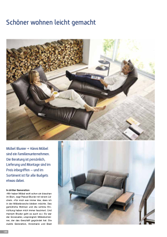 «Wir haben Möbel wohl schon ein bisschen im Blut», sagt Pascal Blunier mit einem Lä- cheln. «Für mich war immer klar, dass ich in der Möbelbranche bleiben möchte. Das gemütliche Wohnen und die schöne Ein- richtung haben mich immer fasziniert. Und meinem Bruder geht es auch so.» Es war der Grossvater, ursprünglich Möbelschrei- ner, der das Geschäft gegründet hat. Die zweite Generation, Annemarie und Beat