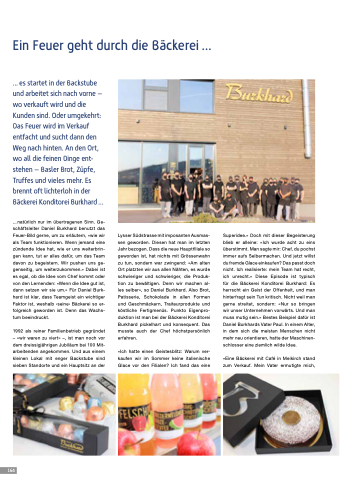 ...natürlich nur im übertragenen Sinn. Ge- schäftsleiter Daniel Burkhard benutzt das Feuer-Bild gerne, um zu erläutern, «wie wir als Team funktionieren. Wenn jemand eine zündende Idee hat, wie er uns weiterbrin- gen kann, tut er alles dafür, um das Team davon zu begeistern. Wir pushen uns ge- genseitig, um weiterzukommen.» Dabei ist es egal, ob die Idee vom Chef kommt oder von den Lernenden: «Wenn die Idee gut ist, dann setzen wir sie um.» Für Daniel Burk- hard ist klar, dass Teamgeist ein wichtiger Faktor ist, weshalb ‹seine› Bäckerei so er- folgreich geworden ist. Denn das Wachs- tum beeindruckt.