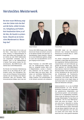 Teil der JELD-WEN-Gruppe wurde. Seither hat sich der Umsatz vervierfacht, anonymer ist der Betrieb deshalb nicht geworden, so Geschäftsleiter Jürgen Grobauer: «Obwohl wir zu einem Weltkonzern gehören, pflegen wir einen sehr freundschaftlichen und en- gen Umgang mit den Kunden.»