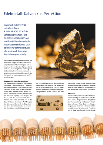 Als traditionelles Familienunternehmen auf dem Gebiet der galvanischen Metallverede- lung hat sich die Unternehmung auf dem na- tionalen und internationalen Hightech-Markt etabliert. Unsere langjährige Erfahrung und die Bereitschaft immer neue, technisch an- spruchsvolle sowie flexible Lösungen für die Kundschaft zu suchen, zeichnen unser Un- ternehmen aus.