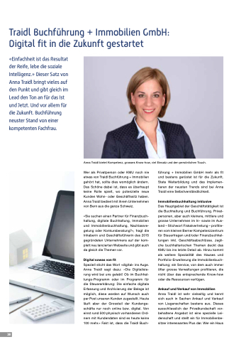 Wer als Privatperson oder KMU noch nie etwas von Traidl Buchführung + Immobilien gehört hat, sollte dies womöglich ändern. Das Schöne dabei ist, dass es überhaupt keine Rolle spielt, wo potenzielle neue Kunden Wohn- oder Geschäftssitz haben. Anna Traidl bedient mit ihrem Unternehmen von Bern aus die ganze Schweiz.