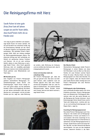 «Ich mag es gerne ordentlich und sauber», sagt Sarah Pulver mit einem Lächeln. Als sie sich beruflich neu orientieren wollte, lag die Entscheidung deshalb auf der Hand, im Bereich Hygiene und Sauberkeit etwas aufzubauen. Sie gründete Pulver’s Reini- gungen 2009. Ganz am Anfang erledigte sie Wohnungsendreinigungen alleine. Der allererste Auftrag war sehr aufwändig, ein Stöckli mit zahlreichen kleinen Fenstern und Nischen. «Es ist ein sehr schönes Gefühl, alleine in einer Wohnung zu sein», sagt Sarah Pulver. «Eine frisch geputzte Wohnung oder ein sorgfältig gereinigter Büroraum machen mich einfach glücklich!» Heute gehören zwei Mitarbeitende zum Team dazu.