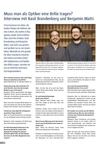 Frisch kommen sie daher, die beiden Filialen der Brillerei; die eine in Bern, die andere in Rig- gisberg, beide 2019 eröffnet. Aber auch ihre Inhaber, Basil Brandenberg und Benjamin Matti, sind nicht von gestern und sprühen nur so vor neuen Ideen. Weshalb sie sich gerade für diese Standorte entschie- den haben und wieso (fast) alle Optikerinnen und Optiker eine Brille tragen, verraten sie uns im ehrlichen Interview