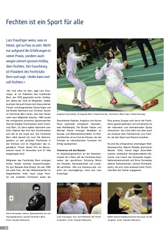 «Wir sind offen für alle», sagt Lars Frau- chiger. Er ist Präsident des Fechtclubs Bern, der 1925 gegründet wurde. Anfäng- lich zählte der Club 20 Mitglieder. Später wuchsen die auch heute noch bewunderten Florett- und Degenfechter Daniel Giger und die Brüder Bernhard und Christian Kauter im Fechtclub Bern heran, was dem Verein viele neue Mitglieder brachte. 1980 wurde der erfolgreiche polnische Spitzensportler Henryk Nielaba Fechtmeister beim Fecht- club Bern. 20 Jahre später übernahm sein Sohn Gabriel das Amt des Fechtmeisters und übt es bis heute aus. Der Fechtclub Bern zählt derzeit mit rund 150 Aktivmit- gliedern zu den grössten Fechtclubs in der Schweiz und ist Organisator des le- gendären «Tissot Grand Prix de Berne», welcher heuer im November zum 57. Mal ausgetragen wird.