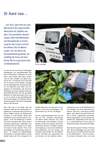 ... von Thun, über Bern bis nach Biel betreut die Liegenschafts- dienst Bern AG Objekte von über 120 namhaften Verwal- tungen. Man hält Miethäuser und Bürogebäude in Schuss, sorgt für den Garten und hat ein offenes Ohr für Mieter- sorgen. Vor 40 Jahren als Einmannbetrieb gestartet, be- schäftigt die Firma mit dem Berner Bär im Logo heute über 35 Mitarbeitende.