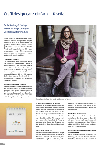 «Aues, wo me druckt cha ha», sagt Thania Ramseier lachend. Die gelernte Polygra- fin machte sich 2019 selbstständig und gründete die Einzelfirma Diseña. Seither gestaltet sie Logos und Drucksachen für Privat- und Geschäftskunden. Ob Hoch- zeitseinladung oder Firmenbroschüre, ob Briefbogen oder Zeitschrift – Thania gestaltet mit Freude und Elan.