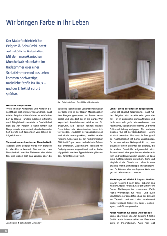 «Viele meiner Kundinnen und Kunden be- schäftigen sich mit ihrer Gesundheit», sagt Adrian Pelgrim. «Sie möchten es schön ha- ben zu Hause – und sie möchten Giftstoffe nach Möglichkeit vermeiden.» Deshalb hat sich die Jan Pelgrim & Sohn GmbH auf Bauprodukte spezialisiert, die die Mensch- heit bereits seit Tausenden von Jahren er- folgreich nutzt.