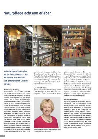 gehören nebst ätherischen Ölen – von Bergamotte über Lavendel bis Zitrone – auch Bücher, Aromavernebler, Wickel und weitere Artikel, die für Wohlbefinden sorgen. Sämtliche im Lädeli in München- buchsee erhältlichen Produkte können via Webshop auch direkt nach Hause bestellt werden. Neu im Sortiment sind verschie- dene Do-it-yourself-Sets. Mit Anleitung und allen Zutaten können Kund*innen ihren eigenen Lippenbalsam, das eigene Erkäl- tungsbad oder die eigene Ringelblumen- Salbe zu Hause selber herstellen.