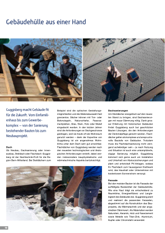 Beispiel sind die optischen Gestaltungs- möglichkeiten und die Materialauswahl fast grenzenlos. Dächer können mit Ton- oder Betonziegeln, Naturschiefer, Faserze- mentplatten, Glas, Stein, Holz oder Metall eingedeckt werden. In den letzten Jahren sind die Anforderungen an Dachgeschosse gestiegen, weil sie heute oft als Wohnraum genutzt werden – dank der Expertise von Guggisberg ist ein angenehmes Wohn- klima unter dem Dach sehr gut erreichbar. Flachdächer von Guggisberg werden nach den neuesten technologischen und ökolo- gischen Anforderungen erstellt, dabei wer- den insbeonsdere bauphysikalische und wärmetechnische Aspekte berücksichtigt.