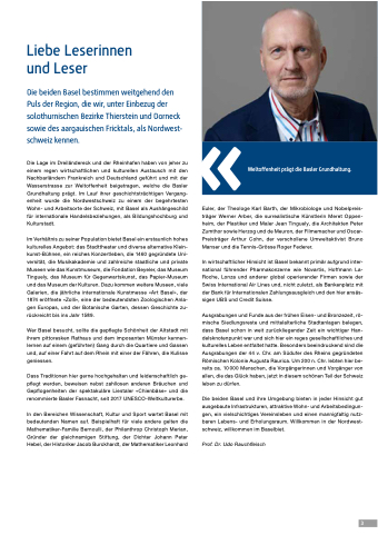 Die Lage im Dreiländereck und der Rheinhafen haben von jeher zu einem regen wirtschaftlichen und kulturellen Austausch mit den Nachbarländern Frankreich und Deutschland geführt und mit der Wasserstrasse zur Weltoffenheit beigetragen, welche die Basler Grundhaltung prägt. Im Lauf ihrer geschichtsträchtigen Vergang- enheit wurde die Nordwestschweiz zu einem der begehrtesten Wohn- und Arbeitsorte der Schweiz, mit Basel als Aushängeschild für internationale Handelsbeziehungen, als Bildungshochburg und Kulturstadt.