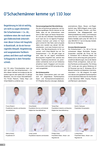 Die Schachenmann + Co. AG ist Teil der schweizweit tätigen Burkhalter Gruppe. Ausserdem unterhält die Firma mit der K. Schweizer AG in Allschwil, Basel und Riehen schon Jahre lang sehr gute partner- schaftliche Beziehungen, die es den Basler Elektro-Profis ermöglichen, stets auf wei- tere Fachleute zurückzugreifen. Per Anfang 2021 wurde gar eine ganze Abteilung mit 35 Personen aus der K. Schweizer AG im Bereich Industrie und Gewerbe in die Scha- chenmann + Co. AG integriert. Es ergibt sich daraus eine gestärkte Fachkompetenz und ein deutlicher Mehrwert für die Kunden in den Bereichen MSR, Chemie, Pharma und Reinraum-Laborbauten.