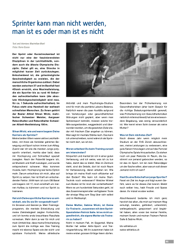 Hat sich Deine sportliche Karriere so ent- wickelt, wie Du sie Dir vorgestellt hast? Im Grossen und Ganzen ja. Mein Trainings- programm, die mentale Entwicklung und meine Zielstrebigkeit zeigten Fortschritte, und ich konnte erste brauchbare Resultate vorweisen. Mehr denn je war für mich und mein Umfeld klar, dass meine Entscheidung zum Sprint die richtige war. Das Training macht mir ebenso Spass wie der sicht- und spürbare Fortschritt. Meine athletische