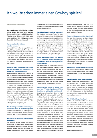 Alles begann mit klassischem Gesang, da war ich schon 22 Jahre alt und hatte eine Lehre als Kellner und das Handelsdiplom ab- geschlossen. Ich nahm Gesangs-, Tanz- und Schauspielunterricht. 1994 fragte mich ein Mitstudent, ob ich nicht Lust hätte, in Aarau im Musical «My Fair Lady» mitzuwirken. So machte ich die ersten Bühnenschritte. Ich verdiente mein Geld tagsüber mit meiner Arbeit im Büro und fuhr abends nach Aarau. Ende 1994 gab ich den Bürojob definitiv auf und konzentrierte mich voll auf die Schau- spielerei. Das nächste Engagement führte mich nach Winterthur in die «Jeff Western Musical Show», wo man mir schon die 2. Be- setzung für eine Hauptrolle gab.