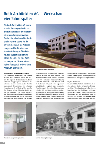 Im Jahr 2020 durfte Roth Architekten AG ei- nige grössere Bauten fertigstellen. Eine da- von ist die Wohnüberbauung in Oensingen, bestehend aus vier Baukörpern mit insge- samt 22 Wohnungen. Die lichtdurchfluteten Wohnungen an sehr attraktiver Lage im Zentrum und dennoch vom Verkehr abge- wandt konnten rasch vermietet werden.