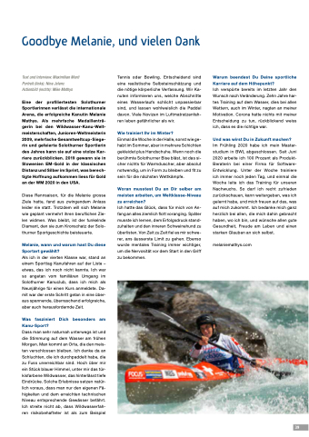 Eine der profiliertesten Solothurner Sportlerinnen verlässt die internationale Arena, die erfolgreiche Kanutin Melanie Mathys. Als mehrfache Medaillenträ- gerin bei den Wildwasser-Kanu-Welt- meisterschaften, Junioren-Weltmeisterin 2009, mehrfache Gesamtweltcup-Siege- rin und gefeierte Solothurner Sportlerin des Jahres kann sie auf eine stolze Kar- riere zurückblicken. 2019 gewann sie in Slowenien EM-Gold in der klassischen Distanz und Silber im Sprint, was berech- tigte Hoffnung aufkommen liess für Gold an der WM 2020 in den USA.