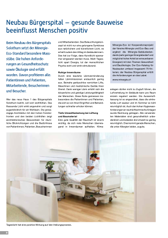Beim Neubau des Bürgerspitals Solothurn setzt der Minergie- Eco-Standard besondere Mass- stäbe. Die hohen Anforde- rungen an Gesundheitsschutz sowie Ökologie sind erfüllt worden. Davon profitieren alle: Patientinnen und Patienten, Mitarbeitende, Besucherinnen und Besucher.